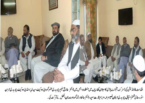 اجلاس میں یہ فیصلہ بھی کیا گیا کہ آئندہ ماہ الخدمت فائونڈیشن کی عمارت کا سنگِ بنیاد جی ٹی روڈ کھاریا ں میں رکھا جائے گا۔ اجلاس میں سال 2011-2012ء کے آڈٹ کے حوالے سے پلاننگ کی گئی۔ نئی صحت پالیسی مرتب کی گئی جس میں الخدمت فائونڈیشن کے زیر انتظام ڈسپنسریوں اور ہسپتال میں کم از کم ایک ایم بی بی ایس ڈاکٹر لازمی طور پر متعین کیا جائے گا ۔ اجلاس میں مزید فیصلہ کیا گیا کہ الخدمت فائونڈیشن کا زون اور یونین کونسل کی سطح پر نظم قائم کیا جائے تاکہ کارکنان اپنی ذمہ داریاں بہتر طریقے سے سرانجام دے سکیں۔ڈاکٹر طارق سلیم نے اجلاس کے اختتام پر دعا کروائی۔ |